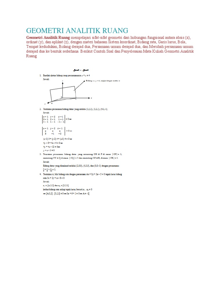 Latexpage berikut ini adalah soal ujian akhir semester beserta pembahasan menyusul mata kuliah geometri analitik ruang sphere geometry tahun ajaran 2017 2018 yang diujikan kepada mahasiswa pendidikan matematika fkip untan semester 2 oleh dr. Kemarin, telah dibahas mengenai contoh soal sistem koordinat, persamaan bidang datar, dan persamaan garis simetrik pada geometri analitik. Kumpulan soal dan jawaban geom. From lh5.googleusercontent.com mata kuliah ini dimaksudkan supaya mahasiswa dapat memiliki pengetahuan, pemahaman tentang : Bank soal geometri analitik ruang mathcyber1997.